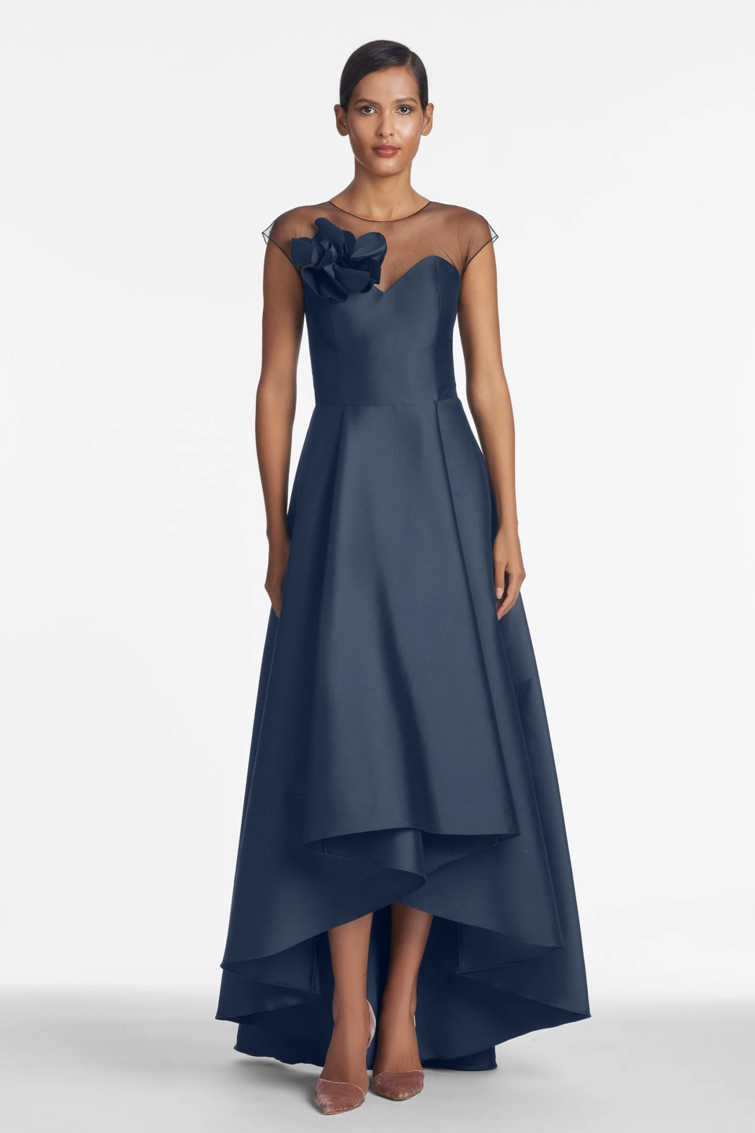 The Blakely gown is both grand and elegant. It boasts Italian Lagattolla stretch-tulle at the neckline and cap sleeve adorned with a Hibiscus flower featuring a picot edge detail. The hi-lo effect of the skirt allows for modesty, as well as a peek at your favorite evening shoe.