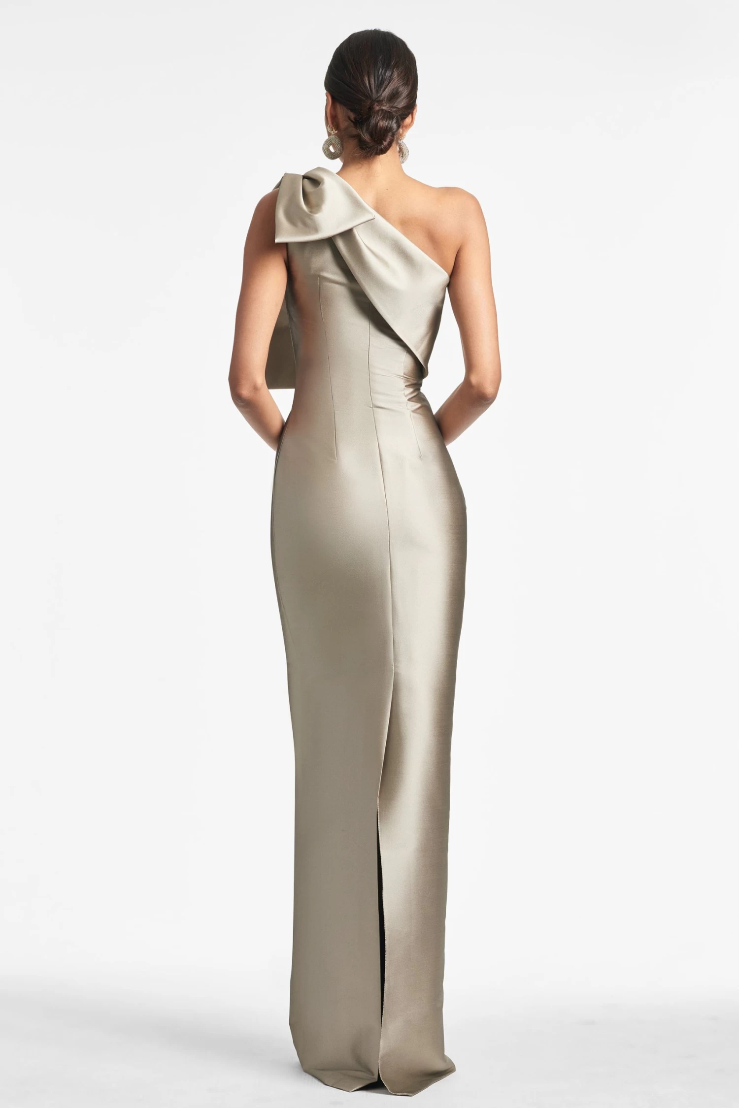 The Bonnie column dress features a sleek sleeve of double-face stretch Mikado with an asymmetric one-shoulder and elegant bow at the shoulder. This modern silhouette is sure to make a statement at any event. Crafted with an eye for detail, you can expect long-lasting quality and timeless style from this piece.Â