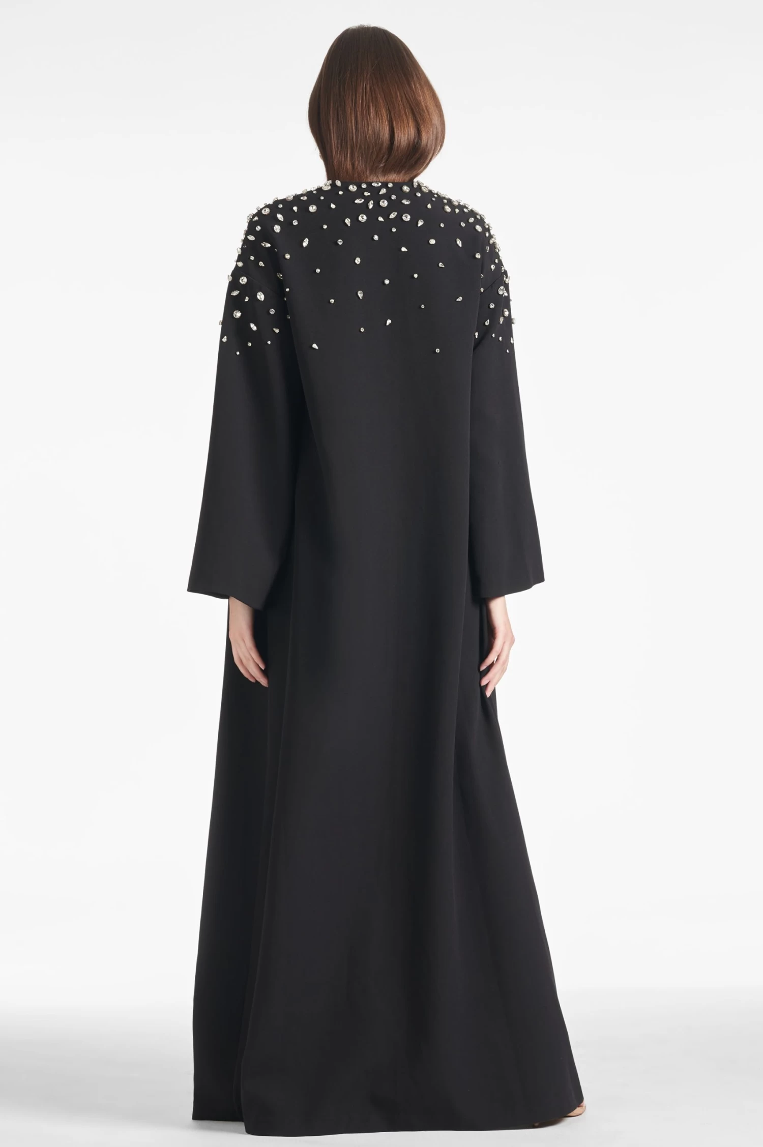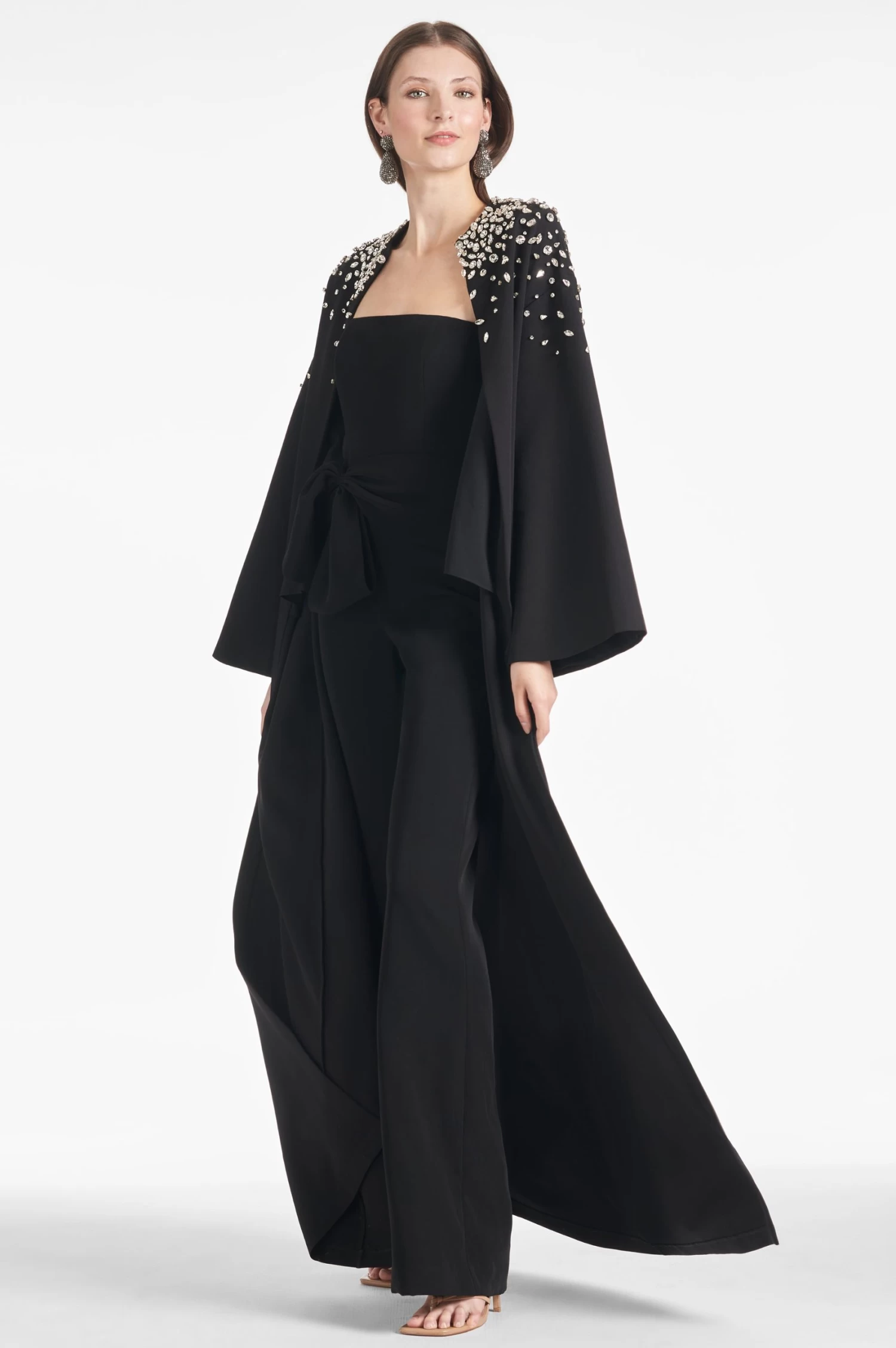 Crafted for a timeless look, the Calliope Coat is a grande addition to any wardrobe. The seasonless crepe fabric gives it a luxurious look with a relaxed, intentionally easy fit. This is not for the faint fashioned hearted, this is for all of our bold glamour girls! Hand placed crystals blanket the neckline and like sparkling stars in the night sky.Â