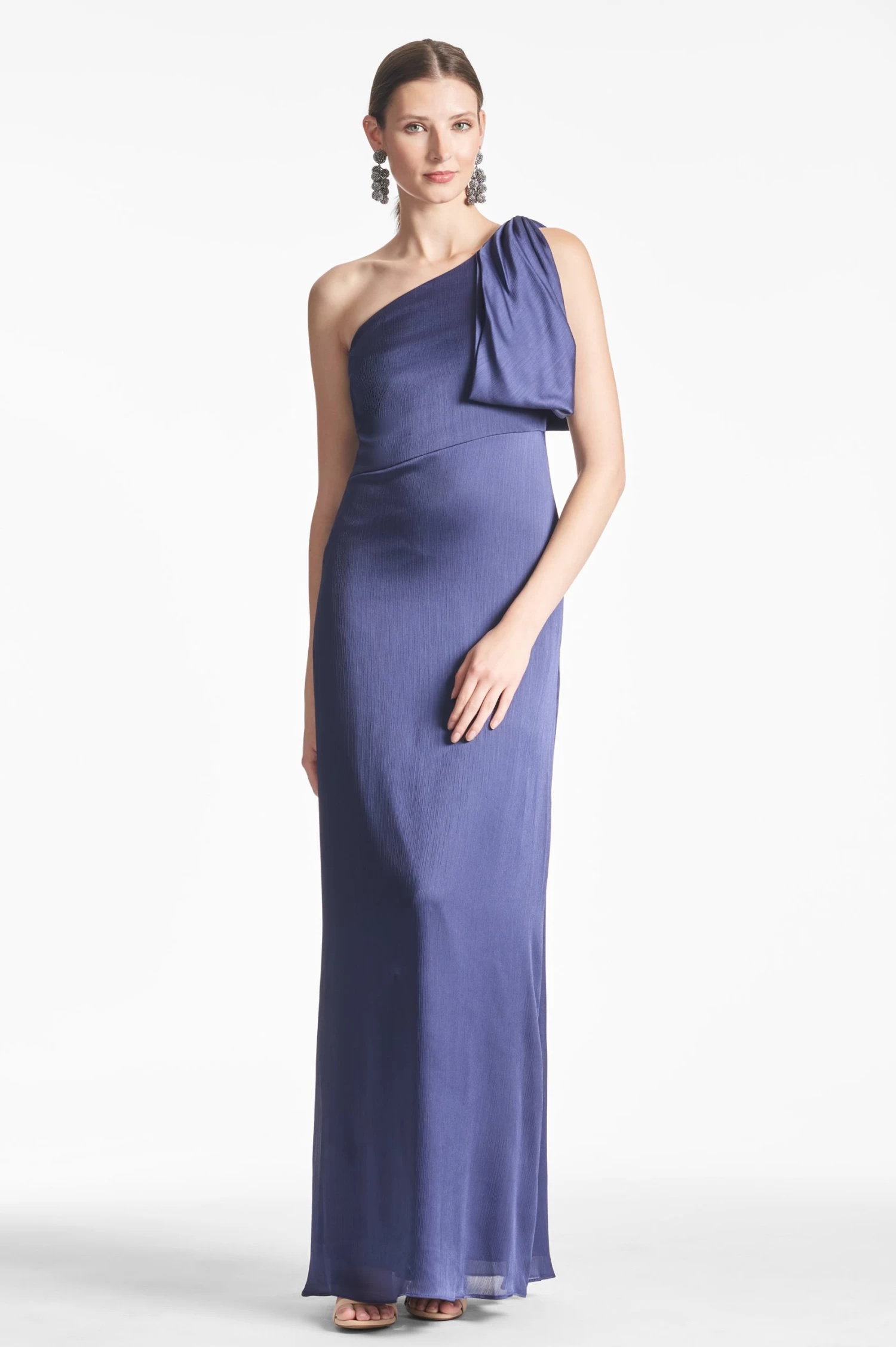The Chelsea gown is an example of balance by design. A sleek sleeve of crinkle georgette is cut on the bias with an asymmetric seam at the waist, creating a column for curves. At the shoulder sits a hand-tucked, stitched-on collapsed bow. We design all of our Essential Social dresses with the intention that they can be enjoyed again and again. After all, a beautiful dress should be worn often and well.