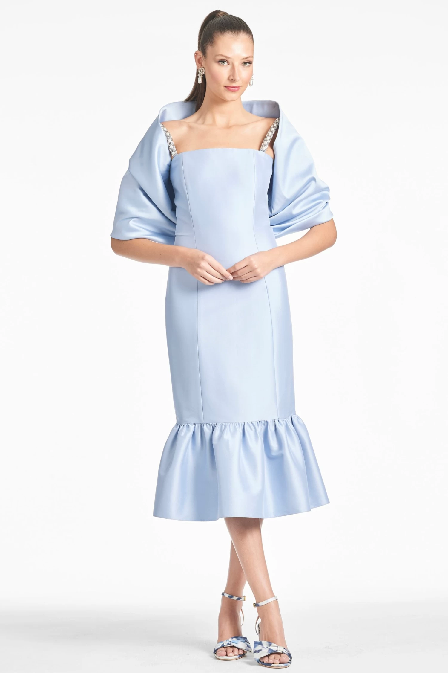 Meet Elise, our new midi in Glacial Blue that’s as elegant as she is pretty. This fit and flare number is made in our stretch Mikado fabric for the most flattering fit, and she features a pop of excitement with her detail at the hem. For an extra touch of glamour: pearl and crystal embellishment on both straps.