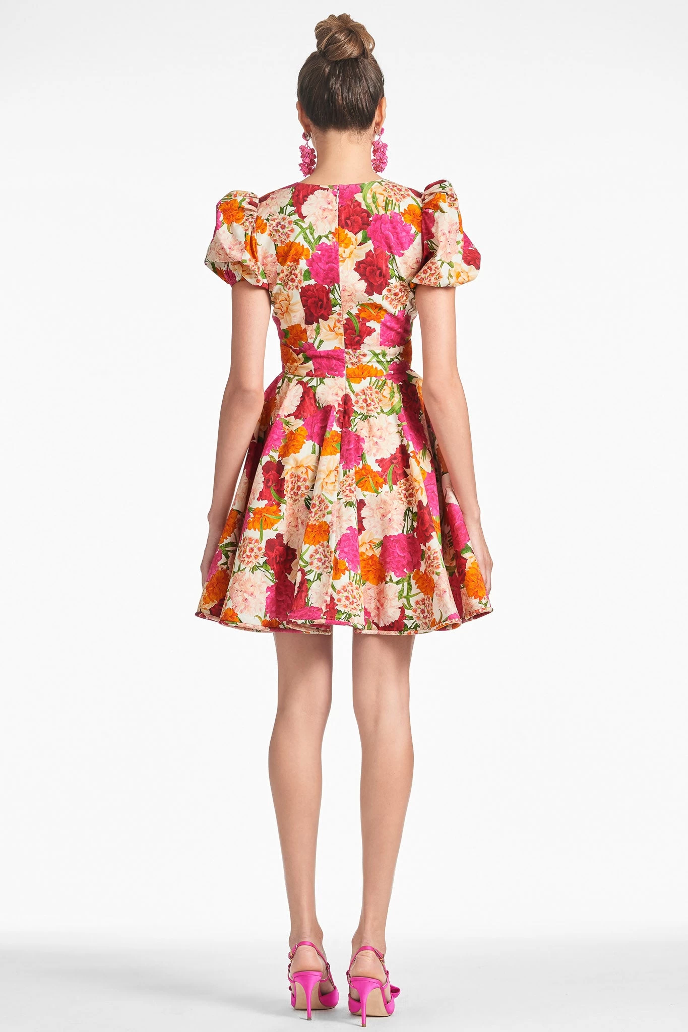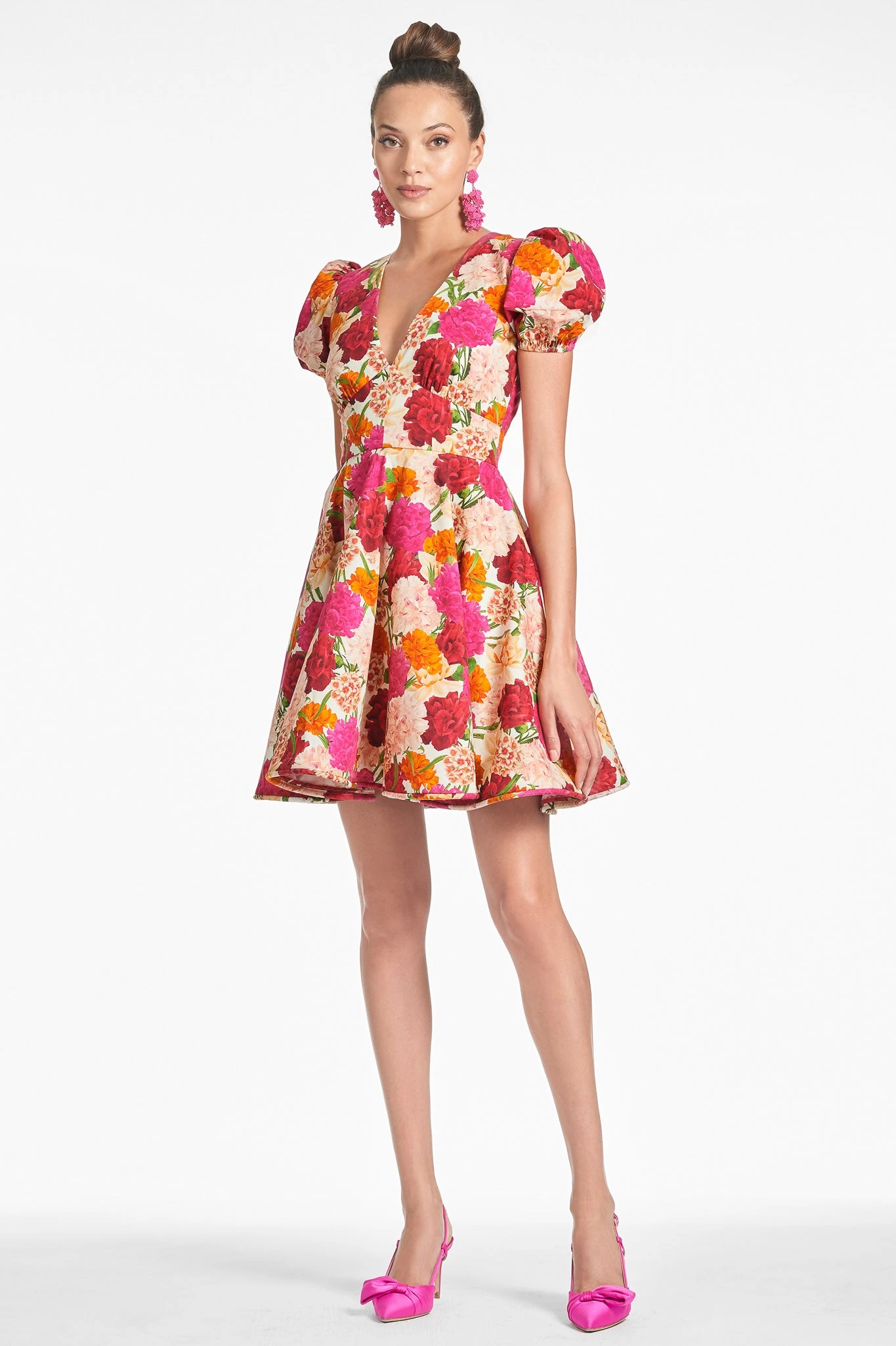 Sweet meets sassy with the Festa. Between the V-neck, puff sleeve, and pleated flare at the waste, this one is the mini dress you’ll have on repeat all summer long. Pair her with statement earrings, a top knot, and our cerise slingbacks, and you will be a vision in floral.