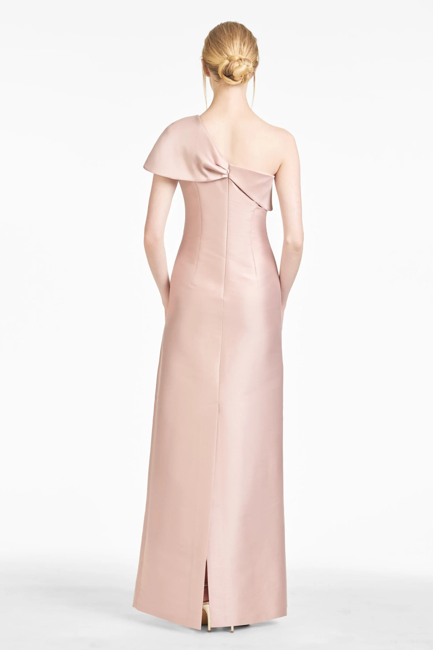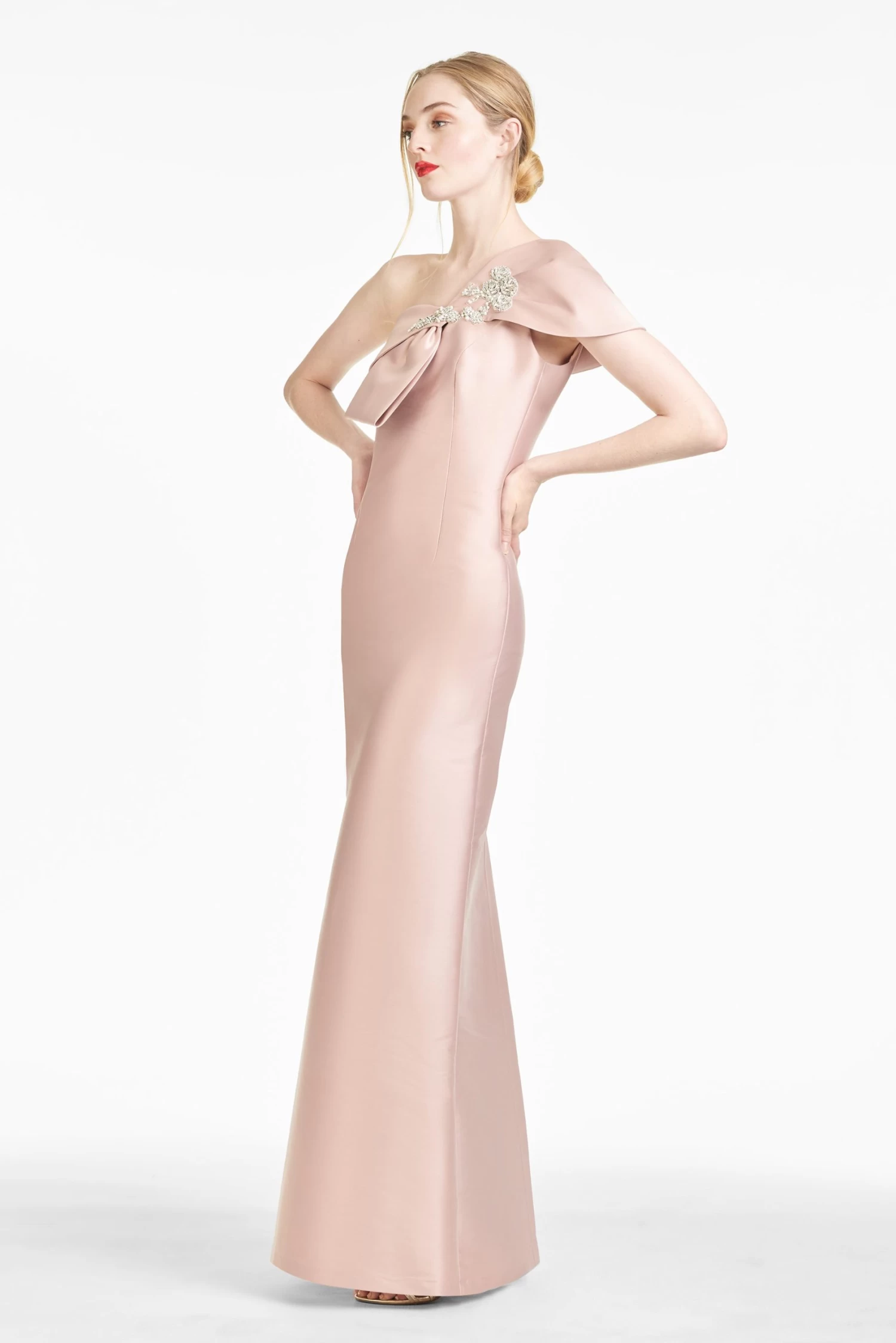 Wrapped in a sleeve of stretch Mikado, the Ines column gown glides over the form to create a clean and subtly sexy silhouette. At one shoulder a swath of Mikado is fashioned into a sculptural sash, adorned with crystals, reminiscent of an heirloom broach.Â
