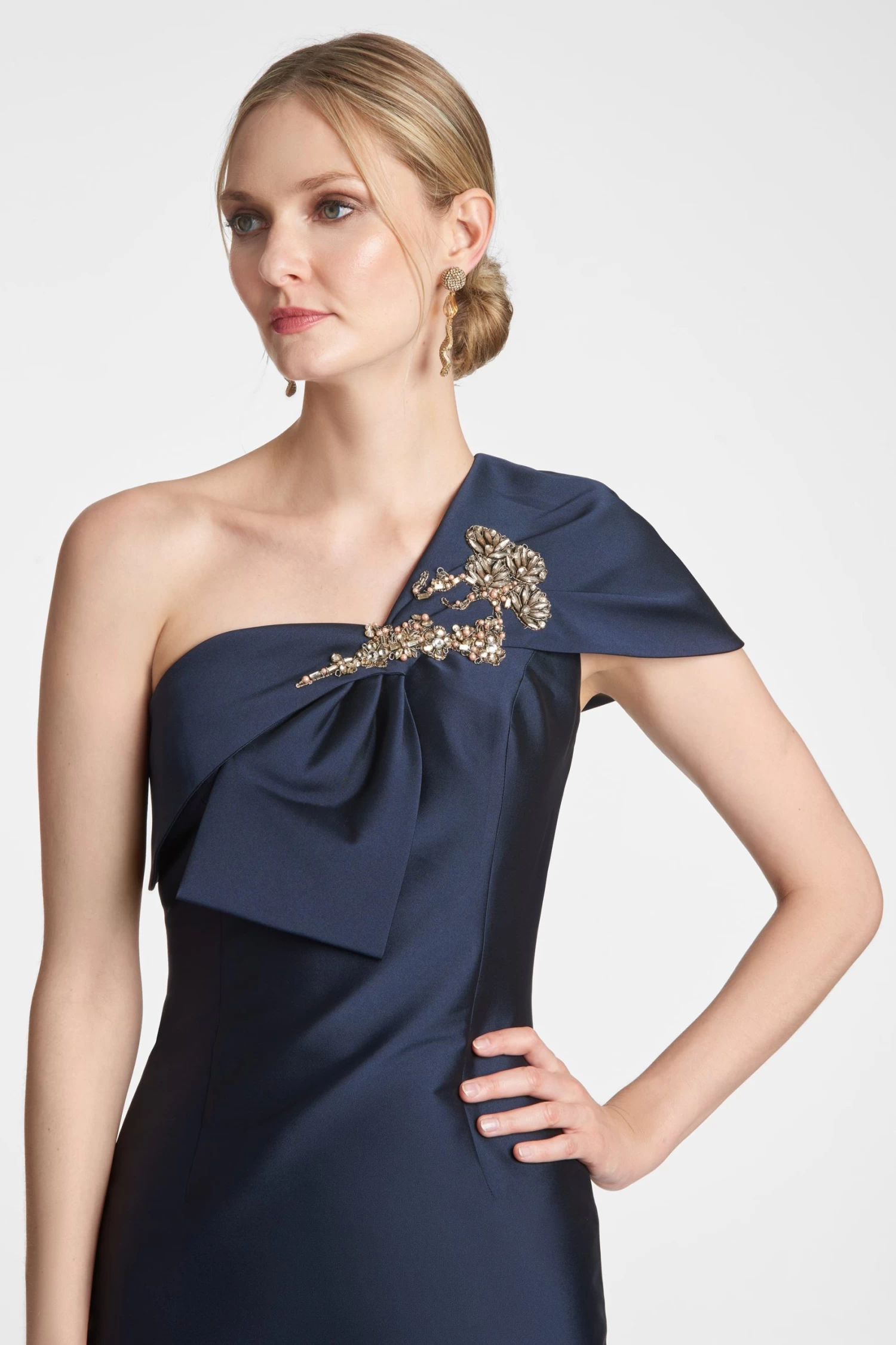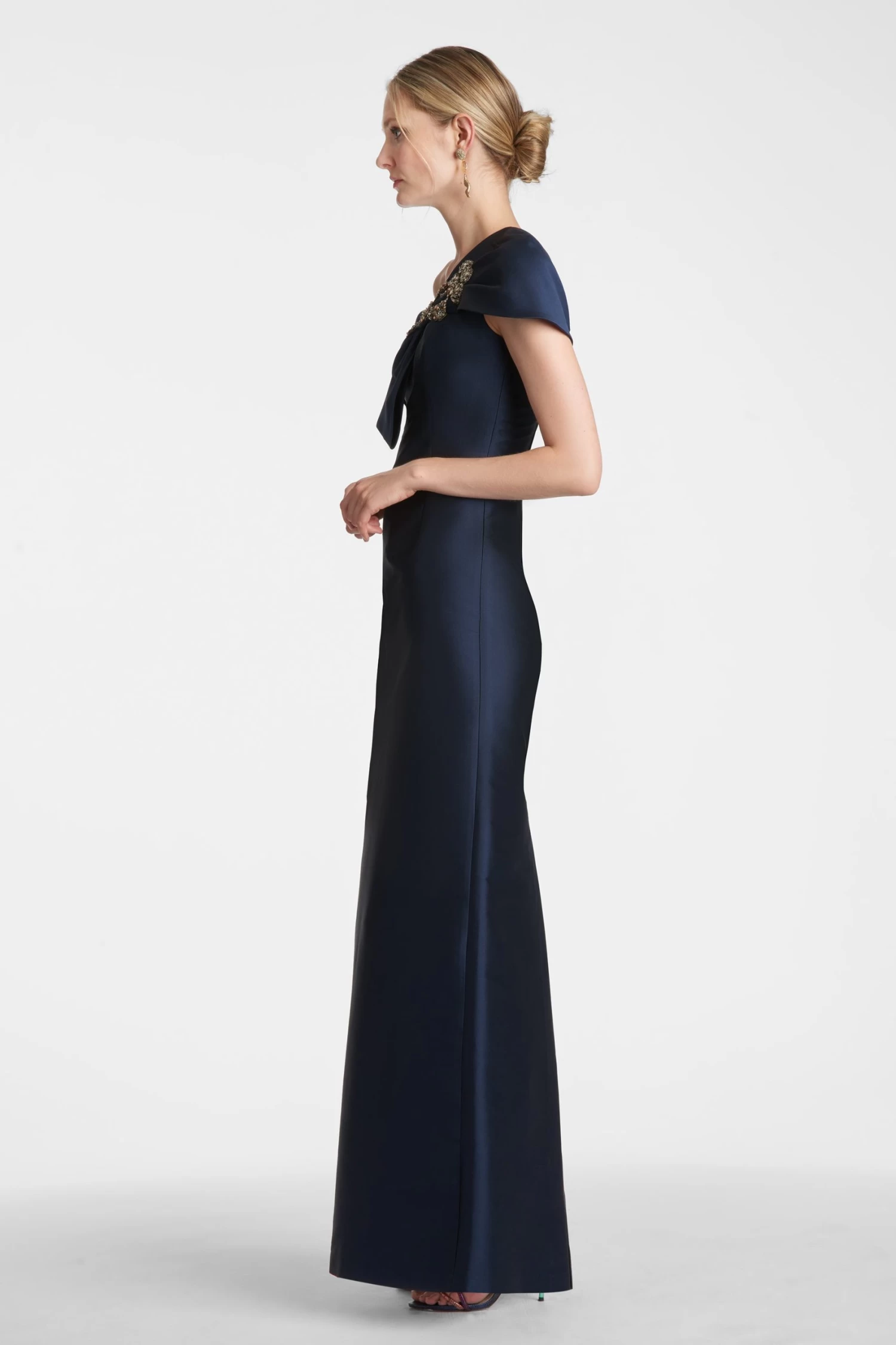 Wrapped in a sleeve of double face twill stretch Mikado, the Ines column gown glides over the form to create a clean and subtly sexy silhouette. At one shoulder a swath of Mikado is fashioned into a sculptural sash, adorned with crystals, reminiscent of an heirloom broach.