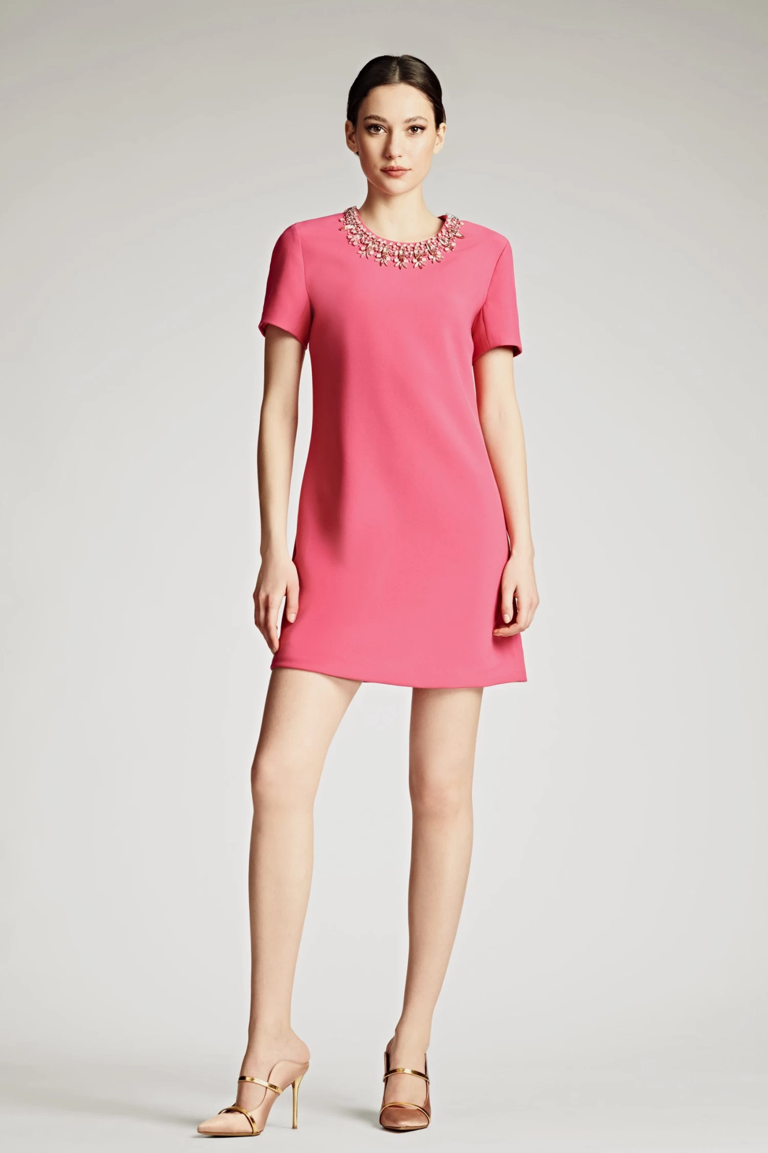 The Lauren Dress is a perfect staple. Its rose pink color and short sleeve design make it ideal for day to night transition. The mini dress features an embellished neckline which adds a sophisticated touch, wearable for any occasion. A must-have for any wardrobe, this dress is delicate, feminine, and flattering.
