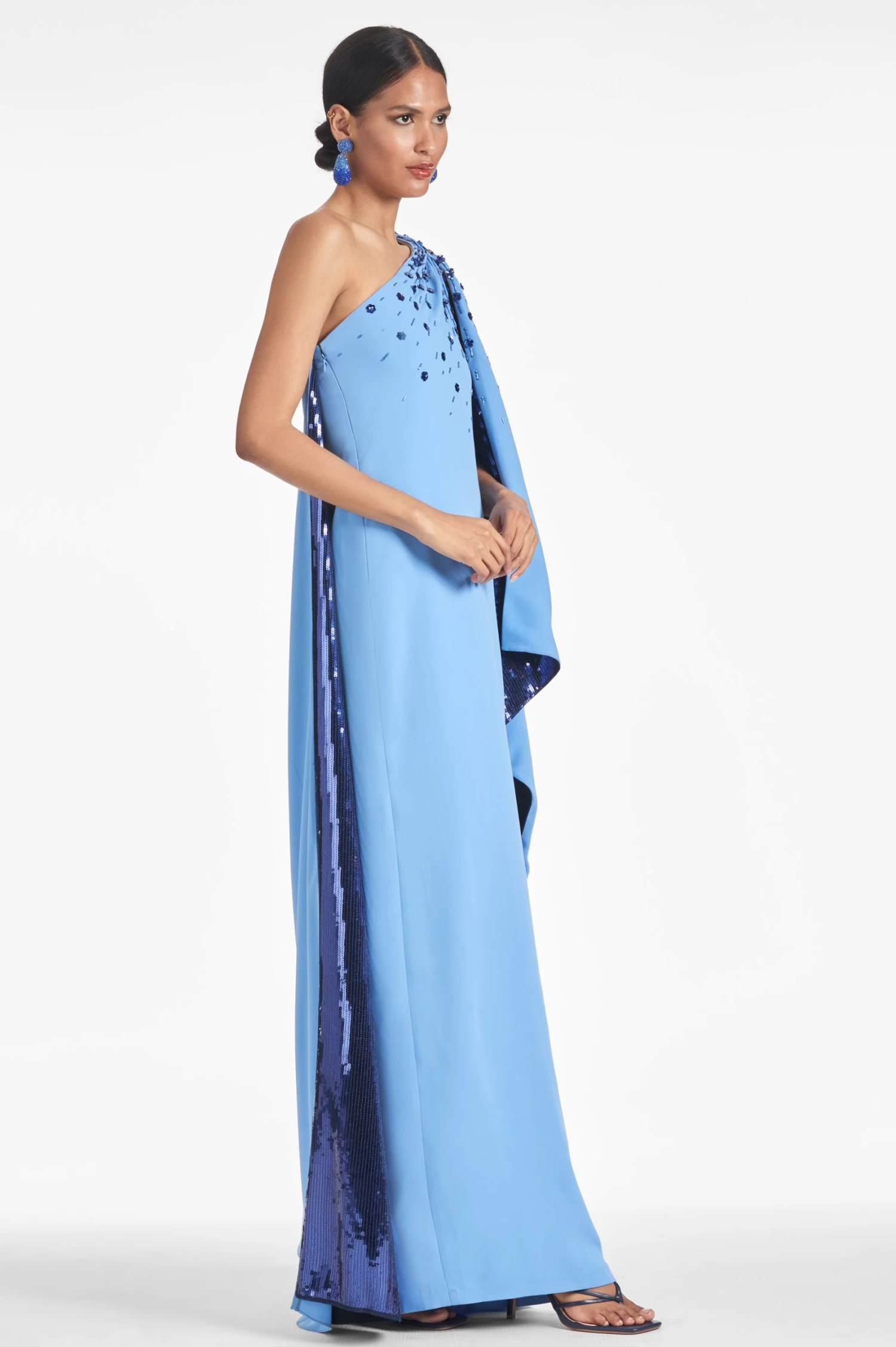 The Leila Gown is truly special: Beautifully designed with shimmering sequins, the column gown has a one-shoulder silhouette in two-tone blue, sure to bring sparkle and elegance to any event.
