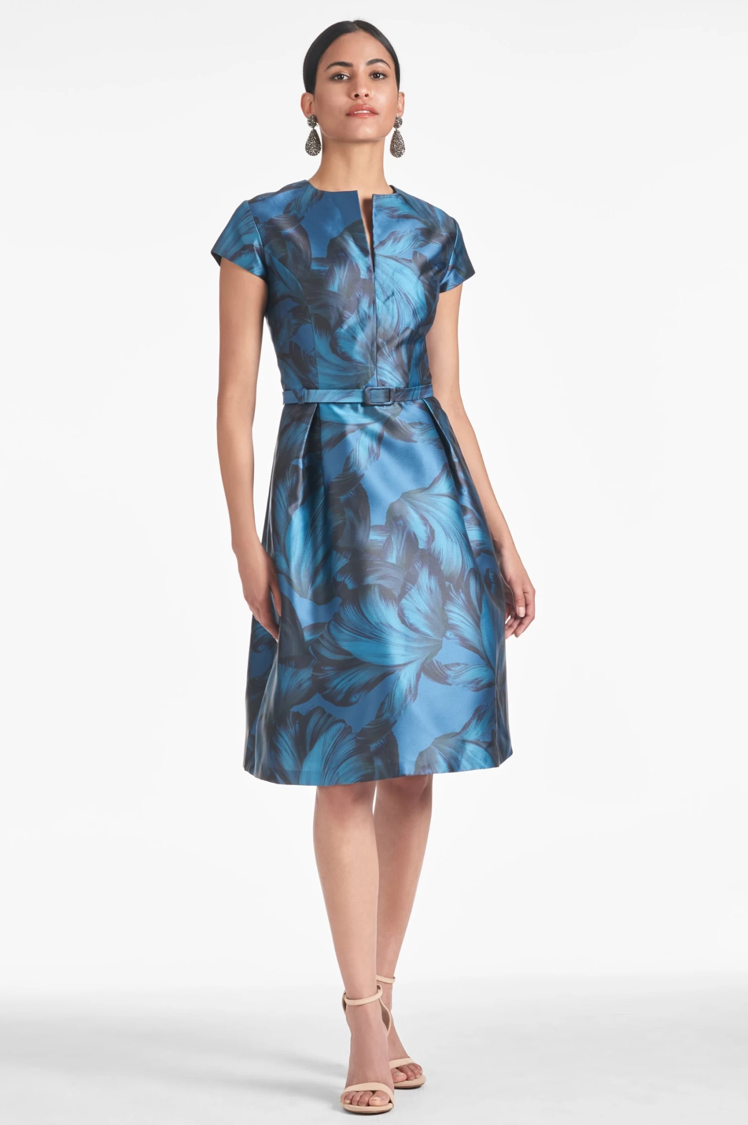 The Maddox Dress is a stylish new look with timeless appeal. Crafted with printed mikado fabric, this tea length dress features a tonal petal print for a classy touch. Perfect for special occasions.