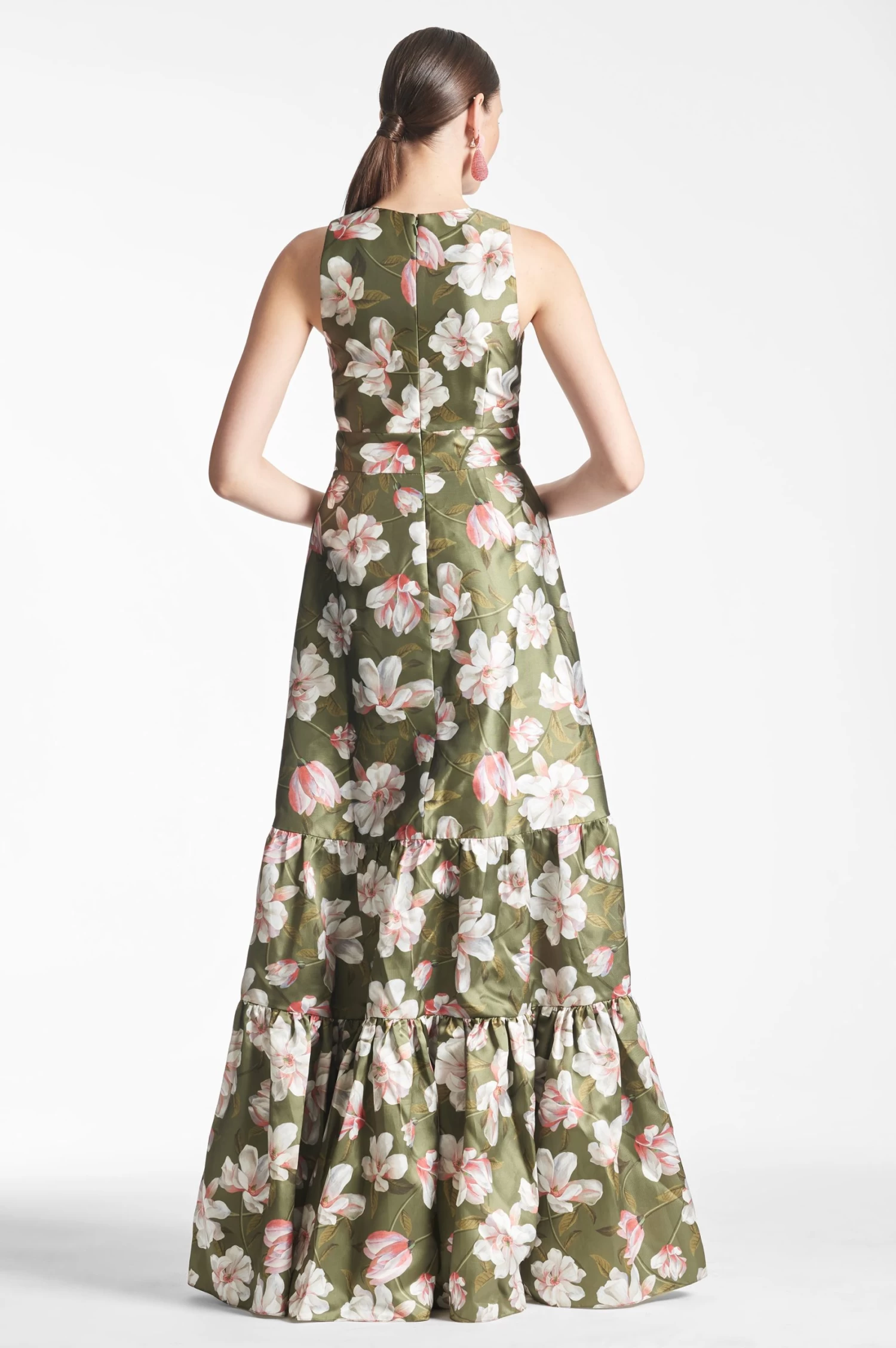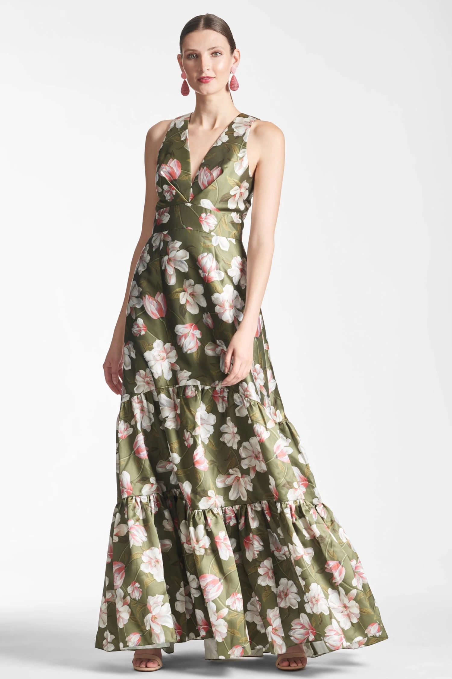 Rori is not for those looking to blend, she is a show-stopping conversation piece. A clean a-line silhouette with deep v-neckline is punctuated through tiers of our moss green magnolia print. Featured in our non-stretch Mikado, she is designed to fit and flatter, cinching at the highest point of the waist and elegantly falling at the hip.