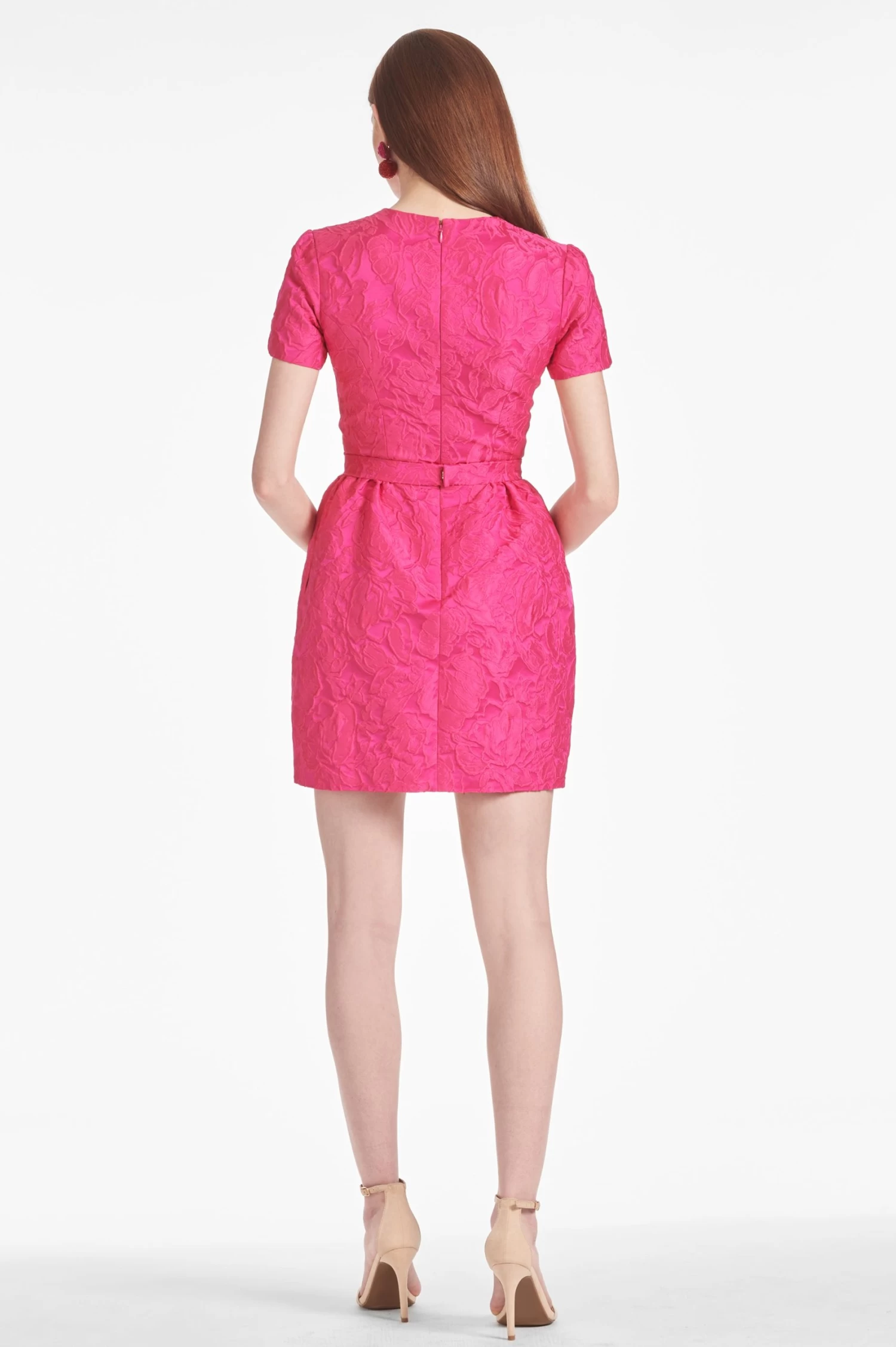 The Rue Dress is perfect for any season. Crafted from pink cloque, this mini dress has short sleeves and a belted waist. It’s the perfect cute look for work, dinner, or a party, and can be styled in many different ways.