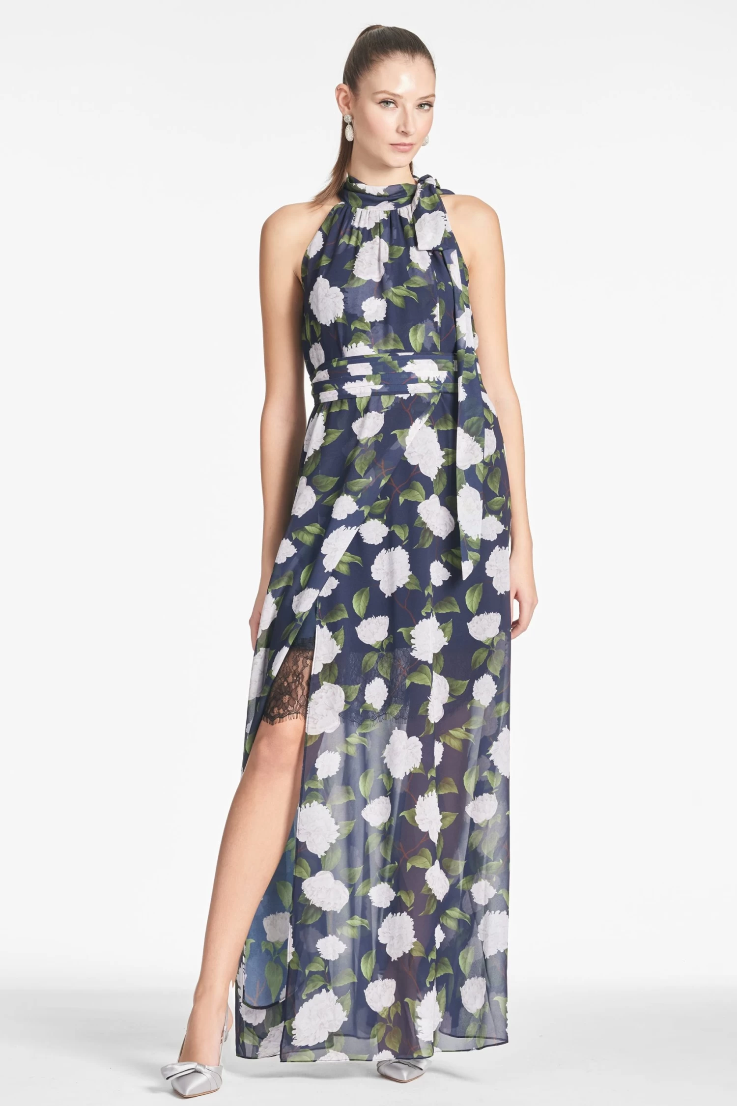 The Selena Dress is the perfect choice for a classic and chic look. Crafted in lightweight chiffon, this dress features a high neckline and a flattering slit, all covered in our navy and ivory moonlit garden print. Elevate any look with this timeless piece.