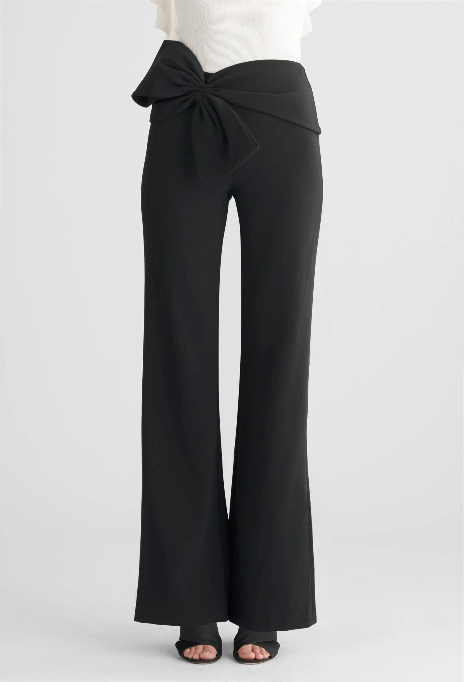 The Whitley pant is featured in our luxe lightweight, stretch crepe, and it is the ideal occasion pant for any season. The magnificent drape of the crepe creates a dramatic effect when paired to the wide-legged silhouette. At the waist a faux full bow-belt sash with stitched down belt both flatters and conceals. A side zip closure allows for a clean finish to this spectacular pant.