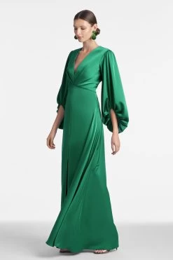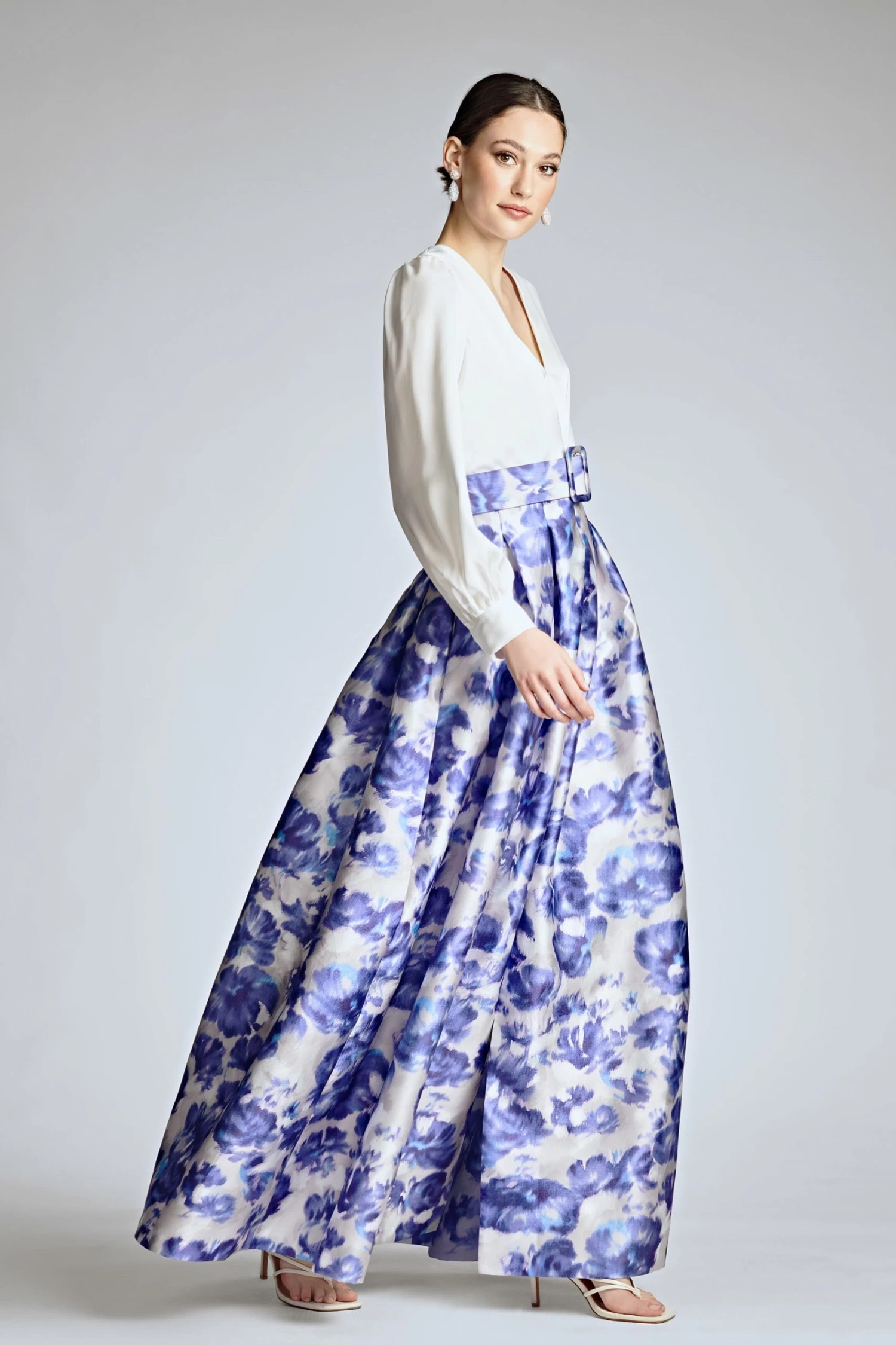 The Zoe Gown is the “Grande Dame” of the occasion. The deep V-neck off-white satin crepe bodice meets the printed Mikado self-belt to join the classic ball skirt with its soft, box pleating. At the front a discreet, but still dramatic, front slit and at each side a side slit pockets.